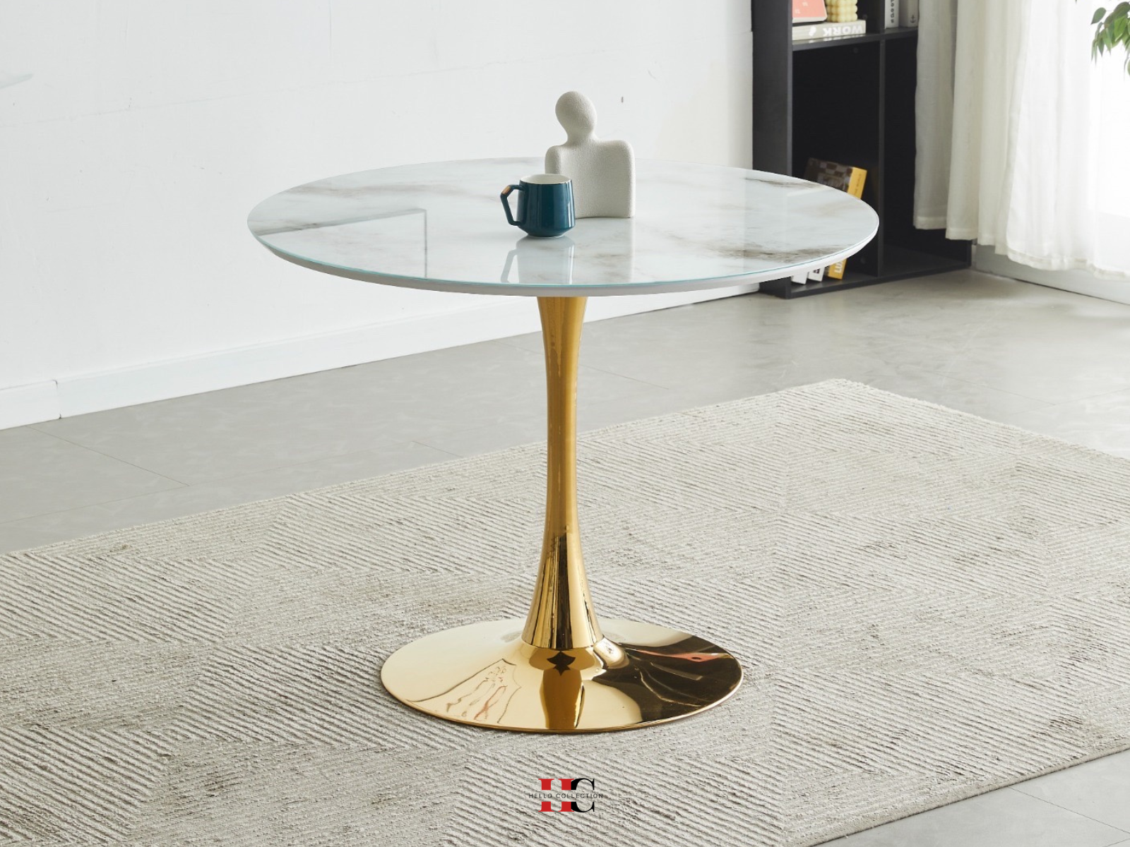 Donnez vie à vos repas avec la table à manger ROSA ronde! Dotée d'un design élégant en or, cette table ajoutera une touche de chaleur à votre espace de vie. Profitez de repas chaleureux et conviviaux grâce à son format rond parfait pour les grandes discussions. Offrez-vous un dîner inoubliable avec la table à manger ROSA ronde!