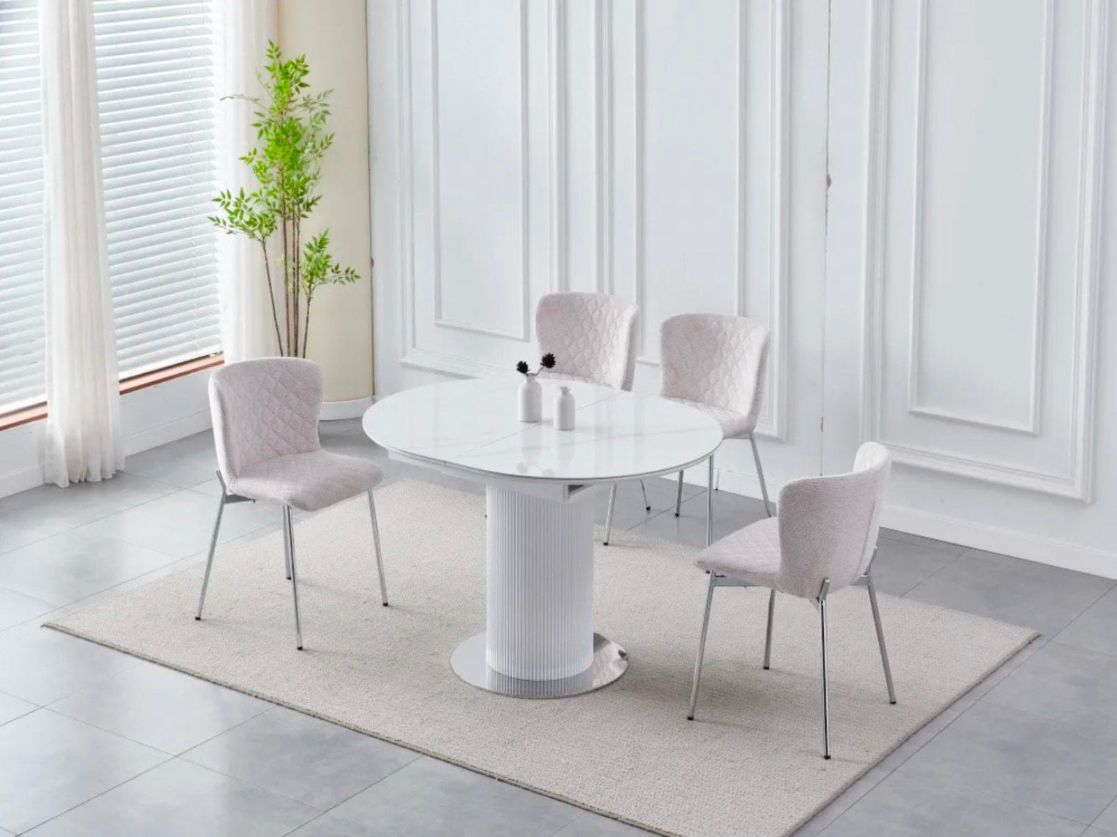 Table a manger extensible sofia en marbre plateau ceramique marbre blanc pied argent.