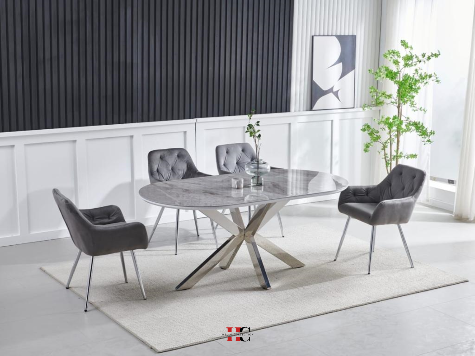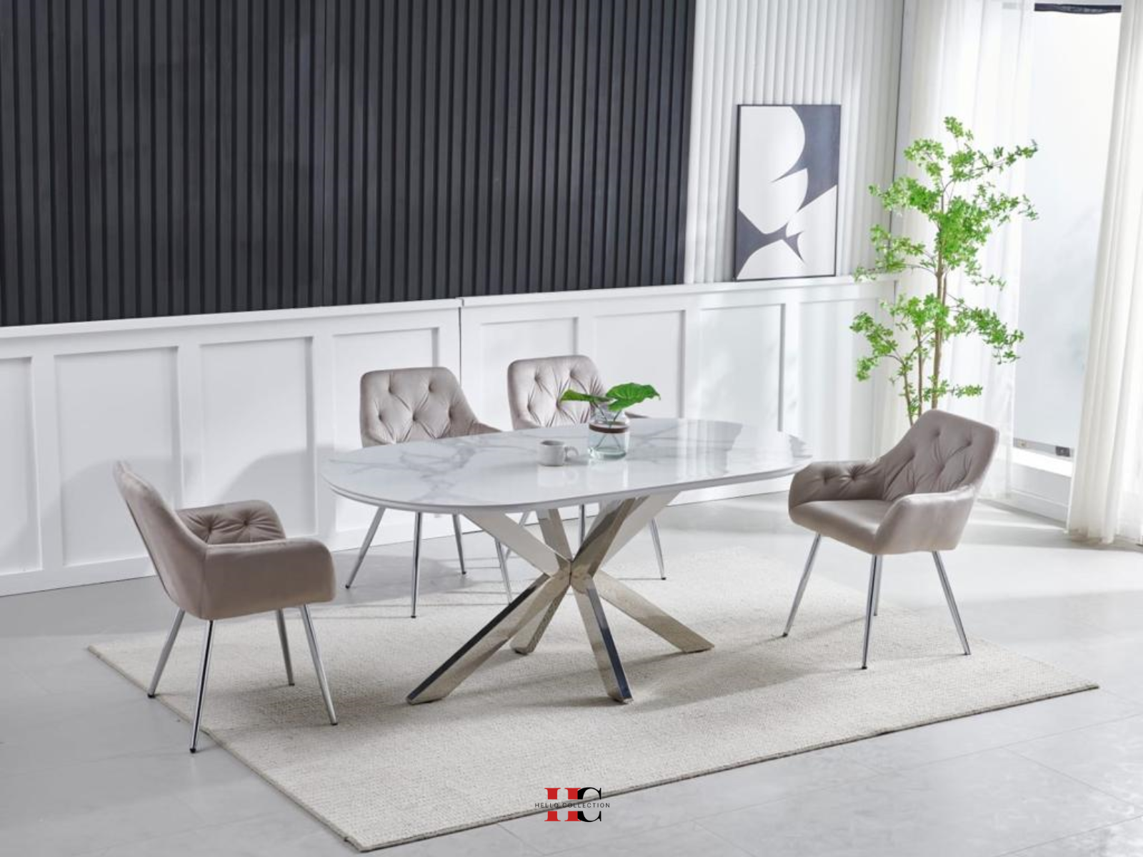 Découvrez une élégance moderne avec notre table à manger Ophélia effet marbre (Chrome). Son design sophistiqué et ses finitions en chrome ajoutent une touche de glamour à votre salle à manger. Profitez de dîners raffinés en famille ou entre amis grâce à cette table de haute qualité.