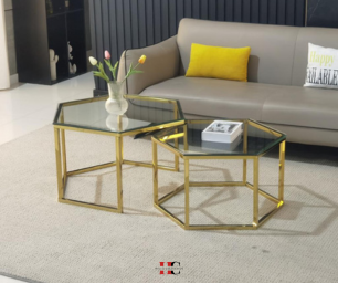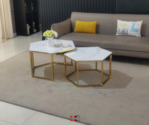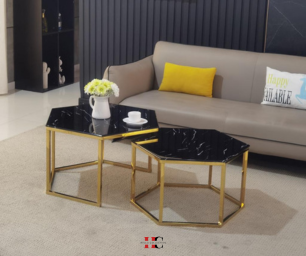 Ajoutez une touche d'élégance à votre salon avec notre table basse hexagonale. Les pieds dorés ajoutent une touche de sophistication tandis que la forme géométrique unique la rend facile à intégrer dans n'importe quel espace.